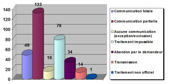 Le Ministère a donné accès total ou partiel aux documents demandés en réponse à cent quatre-vingt deux (182) demandes. Des copies ou CD ROM ont été remis dans tous les cas.