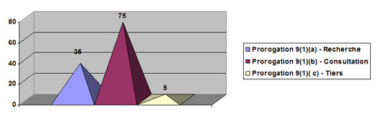 Parmi les cent quinze (115) demandes prorogées, trente-cinq (35) incluaient une prorogation en vertu de l'alinéa 9(1)a) (grand nombre de documents demandés, ampleur des recherches à effectuer ou entrave au fonctionnement de l'institution), soixante-quinze (75) incluaient une prorogation en vertu de l'alinéa 9(1)b) (consultations avec d'autres institutions) et cinq (5) incluaient une prorogation en vertu de l'alinéa 9(1)c) (consultations avec tiers).