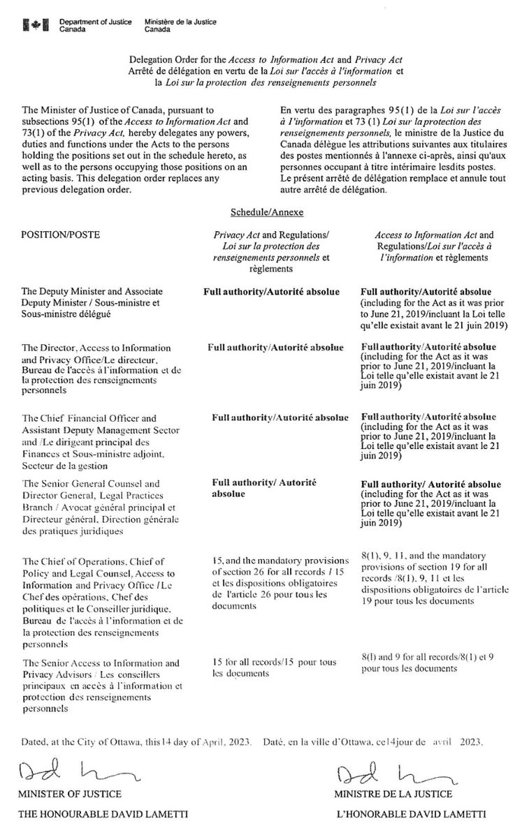En vertu des paragraphes 95(1) de la Loi sur l'accès à l'information et 73 (1) Loi sur la protection des renseignements personnels, le ministre de la Justice du Canada délégue les attributions suivantes aux titulaires des postes mentionnés à l'annexe ci-après, ainsi qu'aux personnes occupant à titre intérimaire lesdits postes. Le présent arrêté de délégation remplace et annule tout autre arrêté de délégation.