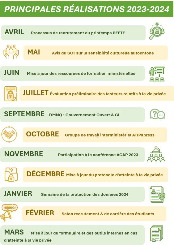 La dernière année a été marquée par la transition, l'innovation, le changement et une réflexion approfondie. Nous avons mis sur pied une modernisation en plusieurs phases de notre Bureau de l'accès à l'information et de la protection des renseignements personnels (AIPRP) afin de nous positionner pour répondre aux demandes et aux attentes actuelles et futures croissantes, difficiles et en évolution de nos intervenants pour les années à venir.